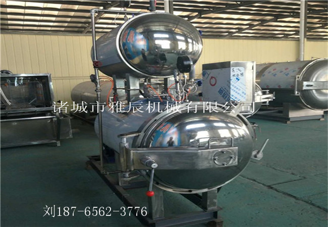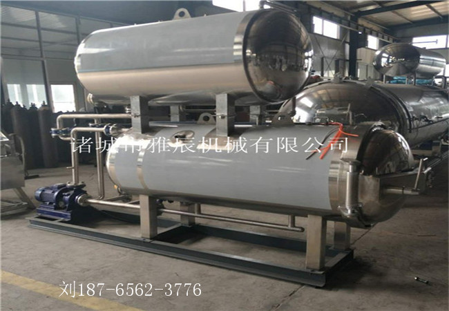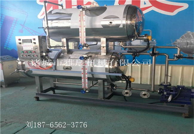 詳細信息 : 小型電加熱水浴殺菌鍋在熱水池內用蒸汽將水溫升至沸騰,啟動水泵用大口徑流量管道把熱水抽到鍋內進行直接殺菌。在熱水達到一定水位時,隨即啟動熱水循環(huán)泵,把鍋內熱水進行循環(huán),采用三點出水八點進水的方式,在循環(huán)時,為了確保鍋內出水點的均勻,采用了三點串聯(lián)式.循環(huán)水經水汽交換消音器快速升溫(用此水汽交換消音器,避免在鍋內加溫時,蒸汽和貨物的直接接觸,使部分貨物溫度偏高),再通過鍋內八個進水點(上、下、左、右各兩點),使熱水直接達到小型電加熱水浴殺菌鍋內進行循環(huán).在鍋內熱水進行循環(huán)的同時,蒸汽角座閥自動開啟進行鍋內升溫,在即將達到溫度時,通過溫度變送器準確的把鍋內溫度輸送到溫控儀,控制蒸汽角座閥進行溫度調節(jié),此調節(jié)閥是根據(jù)鍋內溫度的升降進行逐步調節(jié),以防止鍋內到達溫度時,溫度反沖。在達到設定溫度的同時,關閉蒸汽角座閥門,進入產品殺菌階段(不同產品殺菌時間可調)。在到達殺菌時間后,報警器報警,打開出水閥及水泵,把鍋內熱水用水泵輸送到熱水池,下一鍋殺菌時循環(huán)使用。